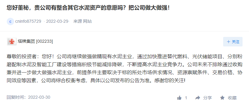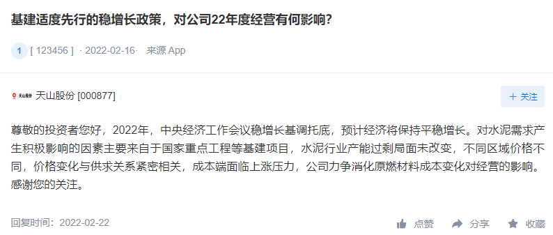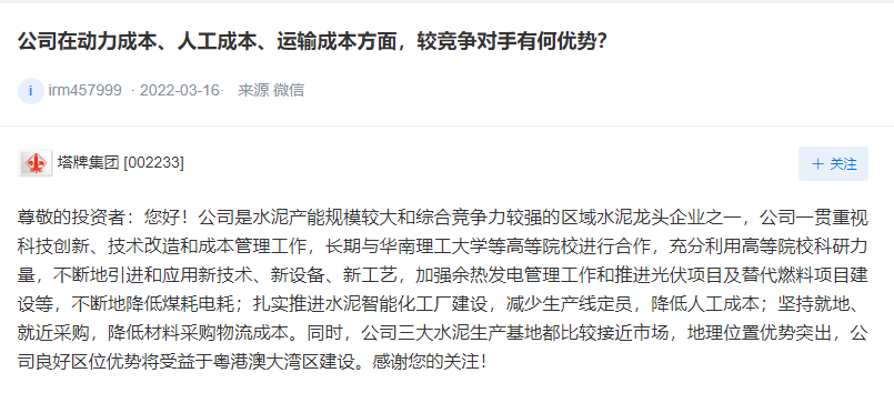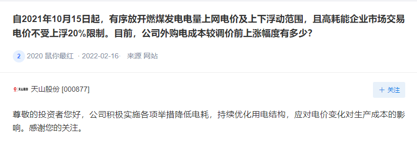 在應(yīng)對需求減少,成本增加方面,天山股份表示,2022年,中央經(jīng)濟工作會議穩(wěn)增長基調(diào)托底,預(yù)計經(jīng)濟將保持平穩(wěn)增長。對水泥需求產(chǎn)生積極影響的因素主要來自于國家重點工程等基建項目,水泥行業(yè)產(chǎn)能過剩局面未改變,不同區(qū)域價格不同,價格變化與供求關(guān)系緊密相關(guān),成本端面臨上漲壓力,公司力爭消化原燃材料成本變化對經(jīng)營的影響。針對電價上漲將積極實施各項舉措降低電耗,持續(xù)優(yōu)化用電結(jié)構(gòu),應(yīng)對電價變化對生產(chǎn)成本的影響。