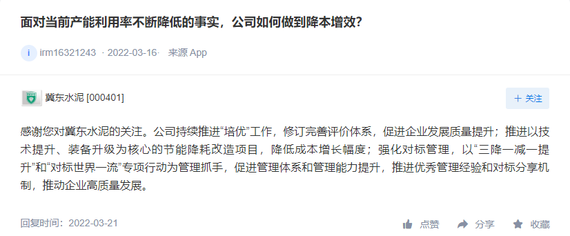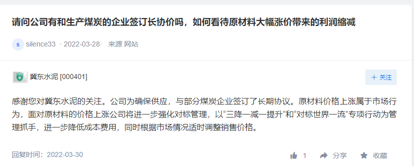 冀東水泥表示,公司為確保供應(yīng),與部分煤炭企業(yè)簽訂了長期協(xié)議。原材料價格上漲屬于市場行為,面對原材料的價格上漲公司將進一步強化對標管理,以“三降一減一提升”和“對標世界一流”專項行動為管理抓手,進一步降低成本費用,同時根據(jù)市場情況適時調(diào)整銷售價格。公司將推進以技術(shù)提升、裝備升級為核心的節(jié)能降耗改造項目,降低成本增長幅度。