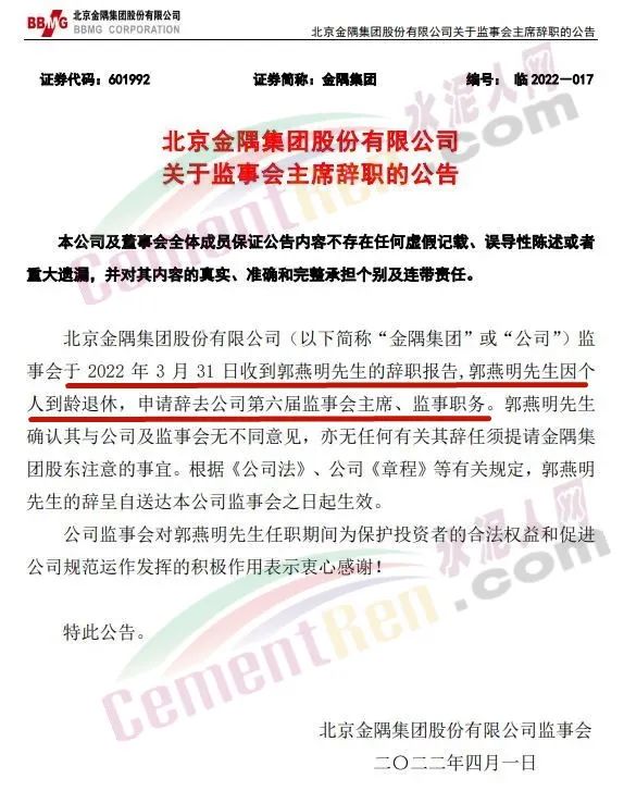 4月1日,金隅集團(tuán)發(fā)布公告稱其監(jiān)事會(huì)于2022年3月31日收到郭燕明先生的辭職報(bào)告,郭燕明先生因個(gè)人到齡退休,申請辭去公司第六屆監(jiān)事會(huì)主席、監(jiān)事職務(wù)。具體公告如下:
