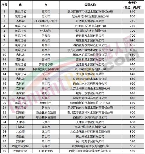 部分水泥企業(yè)P.O42.5散裝水泥參考報(bào)價(jià)