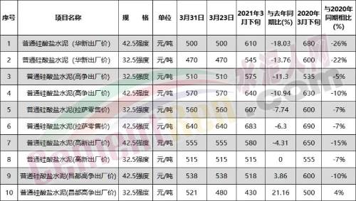 2020年同期數(shù)據(jù)顯示,普通硅酸鹽水泥32.5強(qiáng)度拉薩零售價(jià)為600元/噸,普通硅酸鹽水泥42.5強(qiáng)度拉薩零售價(jià)為690元/噸,十家企業(yè)2020年同期報(bào)價(jià)較目前價(jià)格力十跌一升,跌幅在7%~26%。