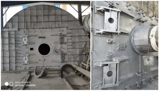 為解決上述難題,該水泥企業(yè)車間組織職工共同探討改造措施,經(jīng)過一段時間的交流和市場調(diào)研后發(fā)現(xiàn),西安綠球環(huán)保設(shè)備有限公司(以下簡稱“綠球環(huán)保”)的不漏風(fēng),不漏料新型對開式窯門具有良好的密封性、安全性、靈活性,能夠解決其水泥窯窯門在設(shè)計、安裝、檢修、安全、環(huán)保等方面存在諸多問題。為此,經(jīng)相關(guān)人員商討決定,該水泥企業(yè)和綠球環(huán)保達(dá)成合作,利用錯峰檢修的時間對其原窯門實施改造。
