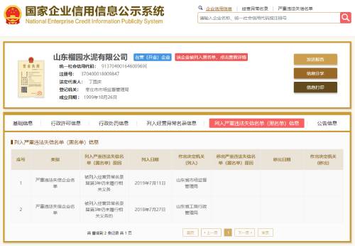 以山東榴園水泥有限公司為例,企業(yè)在2018年7月27日被山東省工商行政管理局列入嚴(yán)重違法失信企業(yè)名單,列入原因?yàn)楸涣腥虢?jīng)營異常名錄屆滿3年仍未履行相關(guān)義務(wù)。2019年7月11日再次被山東省市場監(jiān)督管理局列入嚴(yán)重違法失信企業(yè)名單,列入原因仍為被列入經(jīng)營異常名錄屆滿3年仍未履行相關(guān)義務(wù)。