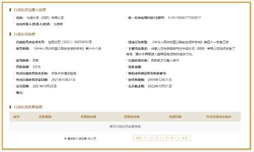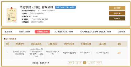 華潤水泥(田陽)有限公司在2021年10月21日被百色市交通運(yùn)輸局罰款2萬元,主要違法事實(shí)為,當(dāng)事人在華潤水泥(田陽)有限公司地點(diǎn)實(shí)施了指使、強(qiáng)令車輛駕駛?cè)顺捱\(yùn)輸貨物的違法行為。