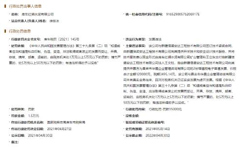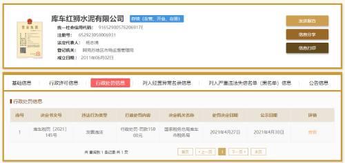 庫車紅獅水泥有限公司因發(fā)票違法被國家稅務(wù)總局庫車市稅務(wù)局于2021年4月27日處罰1500元。主要違法事實(shí)為“虛開發(fā)票”。
