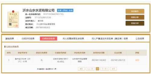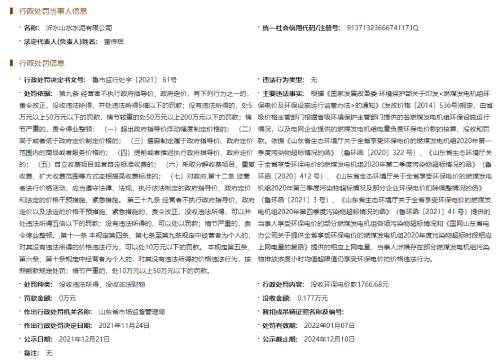 沂水山水水泥有限公司2021年11月24日被山東省市場監(jiān)管局處罰。沒收環(huán)保電價(jià)款1766.68元。違法事實(shí)為當(dāng)事人涉嫌存在部分燃煤發(fā)電機(jī)組污染物排放濃度小時(shí)均值超限值仍享受環(huán)保電價(jià)的價(jià)格違法行為。