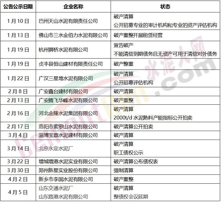 今年1~3月全國(guó)企業(yè)破產(chǎn)重整案件信息網(wǎng)公開發(fā)布了巴州天山水泥有限責(zé)任公司、佛山市三水金佰力水泥有限公司、杭州獅橋水泥有限公司、貞豐縣恒山建材有限責(zé)任公司、廣漢三星堆水泥有限公司、廣安鑫臺(tái)建材有限公司、廣安騰飛華峰水泥有限公司、河北金隆水泥集團(tuán)有限公司、洛陽市紫羅山水泥有限公司、淄博寶鼎水泥建材有限公司、北京永定水泥廠、增城增港水泥實(shí)業(yè)有限公司、鄭州新星實(shí)業(yè)股份有限公司、新鄉(xiāng)市李固水泥有限公司、山東交通水泥廠、山東路港水泥有限公司等16家水泥企業(yè)相關(guān)的破產(chǎn)、破產(chǎn)重整、破產(chǎn)清算、強(qiáng)制破產(chǎn)消息。