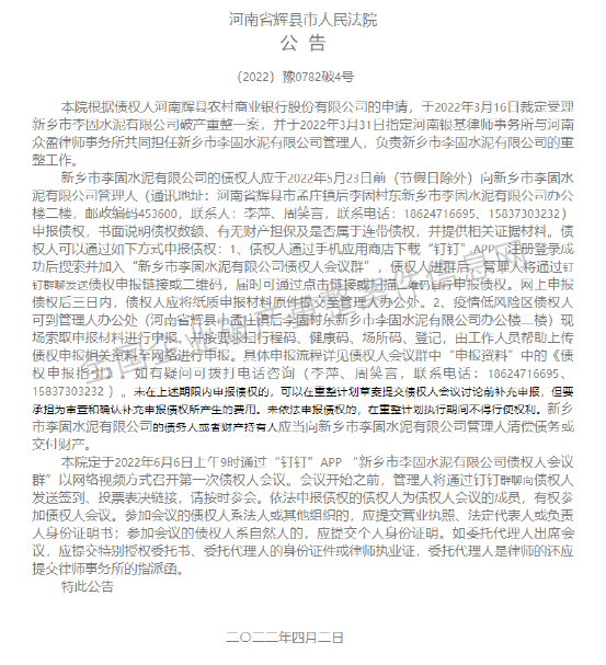 4月2日河南省輝縣市人民法院公告稱,根據(jù)債權(quán)人河南輝縣農(nóng)村商業(yè)銀行股份有限公司的申請(qǐng),于2022年3月16日裁定受理新鄉(xiāng)市李固水泥有限公司破產(chǎn)重整一案,并于2022年3月31日指定河南銀基律師事務(wù)所與河南眾盈律師事務(wù)所共同擔(dān)任新鄉(xiāng)市李固水泥有限公司管理人,負(fù)責(zé)新鄉(xiāng)市李固水泥有限公司的重整工作。定于2022年6月6日上午9時(shí)通過“釘釘”APP“新鄉(xiāng)市李固水泥有限公司債權(quán)人會(huì)議群”以網(wǎng)絡(luò)視頻方式召開第一次債權(quán)人會(huì)議。