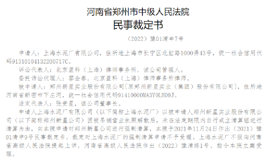 3月30日河南省鄭州市中級(jí)人民法院受理上海水泥廠有限公司對(duì)鄭州新星實(shí)業(yè)股份有限公司的強(qiáng)制清算申請(qǐng)。