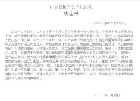 3月4日山東省恒臺(tái)縣人民法院決定書稱,2021年11月19日,山東省淄博市中級(jí)人民法院根據(jù)申請(qǐng)人桓臺(tái)縣人力資源和社會(huì)保障局的申請(qǐng),裁定受理被申請(qǐng)人淄博寶鼎水泥建材有限公司的破產(chǎn)清算申請(qǐng),并指定由山東省桓臺(tái)縣人民法院審理該案。本院于2021年12月14日指定淄博寶鼎水泥建材有限公司清算組擔(dān)任淄博寶鼎水泥建材有限公司管理人。