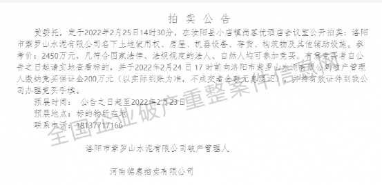 2月17日,洛陽市紫羅山水泥有限公司破產(chǎn)管理人聯(lián)合河南德惠拍賣有限公司發(fā)布拍賣公告稱,受委托定于2月25日公開拍賣洛陽市紫羅山水泥有限公司名下土地使用權(quán)、房屋、機(jī)器設(shè)備、存貨、構(gòu)筑物等,參考價(jià)為2450萬元。