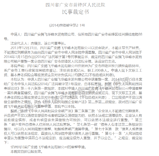 廣安騰飛華峰水泥有限公司破產(chǎn)重整