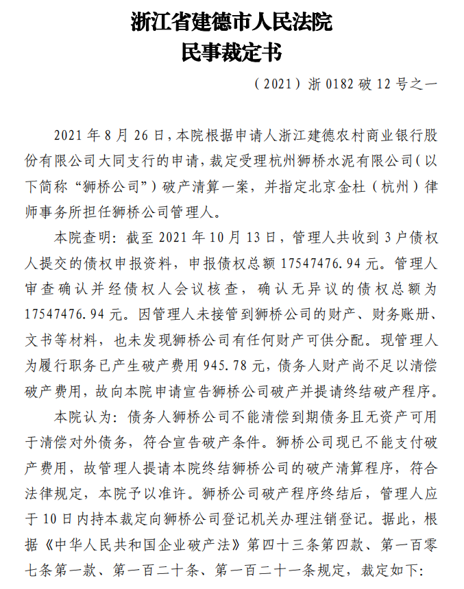 1月19日浙江省建德市人民法院發(fā)布《民事裁定書》稱,2021年8月26日,本院根據(jù)申請(qǐng)人浙江建德農(nóng)村商業(yè)銀行股份有限公司大同支行的申請(qǐng),裁定受理杭州獅橋水泥有限公司破產(chǎn)清算一案,并指定北京金杜(杭州)律師事務(wù)所擔(dān)任獅橋公司管理人。