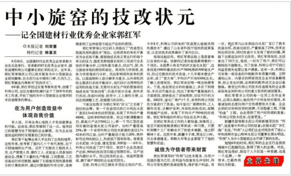 這在今天超產(chǎn)20%已經(jīng)成為常態(tài)的情況下,當(dāng)年就是一項(xiàng)奇跡;后來又繼續(xù)采用更先進(jìn)的“N-MFC”分解爐技術(shù)技術(shù),使這條生產(chǎn)線在仍然沒有擴(kuò)大預(yù)熱器規(guī)格,沒有更換高溫風(fēng)機(jī)的情況下,達(dá)到了1100t/d產(chǎn)量的生產(chǎn)能力。這些成績被中國建材報(bào)以“中小旋窯改造狀元”和”把成熟技術(shù)做到極致就是絕招“為題目分別做了詳細(xì)報(bào)道。并在國內(nèi)水泥行業(yè)再次掀起了中小型旋窯改造之風(fēng),當(dāng)時(shí)行業(yè)內(nèi)流傳著“旋窯改造都可干,想要更好找科邦”的說法。“科邦技術(shù)好,科邦的服務(wù)更好的”也成為當(dāng)時(shí)一些企業(yè)的共識(shí);他們對大、中、小旋窯技改成績同時(shí)也得到了原國家建材局局長王燕某、副局長李儉之和中國水泥協(xié)會(huì)等領(lǐng)導(dǎo)的充分肯定。并親臨改造現(xiàn)場進(jìn)行考察。