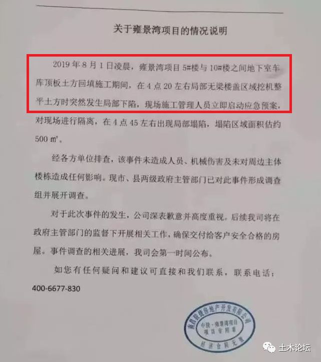 坍塌后,建設(shè)單位發(fā)布緊急通報(bào),極力澄清車庫(kù)坍塌不會(huì)影響主樓結(jié)構(gòu)安全,通報(bào)稱第一時(shí)間上報(bào)政府相關(guān)監(jiān)管部門(mén),隨即住建部門(mén)委派了湖南大學(xué)結(jié)構(gòu)專家去事發(fā)項(xiàng)目進(jìn)行了實(shí)地勘察;