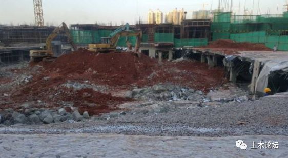 3、土方單位一般是甲方指定,且多為當(dāng)?shù)?ldquo;大佬”,管理難度較大??偘鼏挝还懿粍?dòng)就任其自由發(fā)揮了,車庫(kù)頂板回填時(shí)隨意性大,缺乏監(jiān)管,土方堆成小山包,渣土車滿載通行,大型挖掘機(jī)平土,集中堆載嚴(yán)重超標(biāo)!