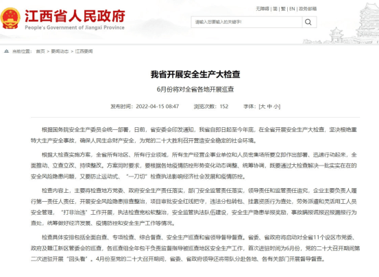 江西省4月14日起至年底,全省范圍開展安全生產(chǎn)大檢查,啟動“打非治違”專項行動
