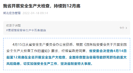 湖北省自4月14日起至12月底在全省開展安全生產(chǎn)大檢查