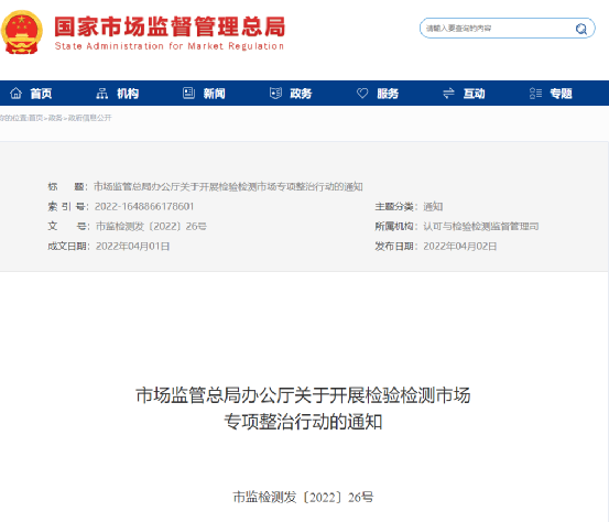 市場監(jiān)管總局為加強檢驗檢測機構(gòu)監(jiān)管,嚴肅查處不實和虛假檢驗檢測等違法違規(guī)行為,于4月至7月底開展檢驗檢測市場專項整治行動。