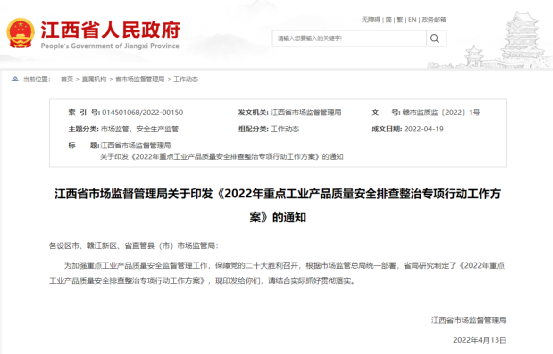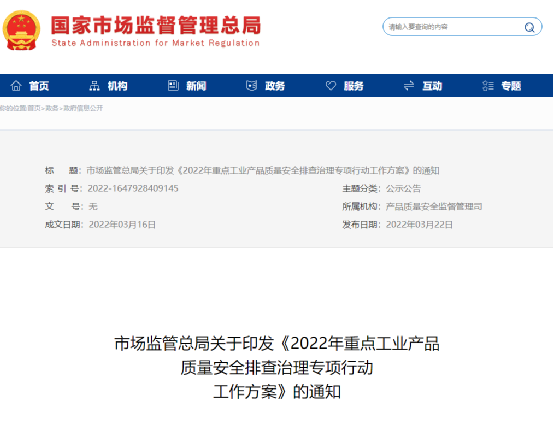 同時江西、福建、山東等省市自治區(qū)通知開展2022年重點工業(yè)產(chǎn)品質(zhì)量安全排查整治專項行動。