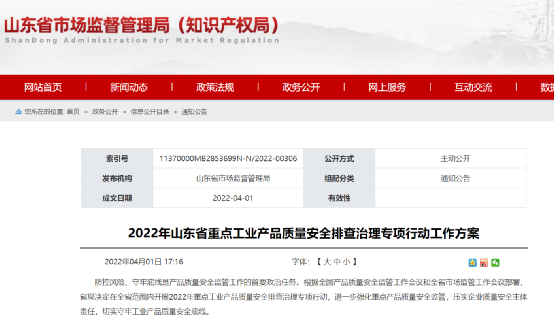 山東省開展重點工業(yè)產(chǎn)品質(zhì)量安全排查治理專項行動