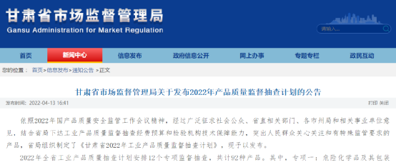 甘肅省市場監(jiān)督管理局公布了《2022年工業(yè)產(chǎn)品質(zhì)量省級監(jiān)督抽查計劃》,2022年將安排12個專項監(jiān)督抽查,共計92種產(chǎn)品。