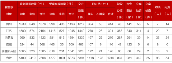 截至4月10日晚22:00,各督察組共收到群眾來電、來信舉報7608件,受理有效舉報6373件,經(jīng)梳理合并重復舉報,累計向被督察對象轉(zhuǎn)辦5394件;被督察對象已辦結(jié)或階段辦結(jié)2083件,其中立案處罰442家;立案偵查25件;約談黨政領(lǐng)導干部98人,問責黨政領(lǐng)導干部54人。第二輪第六批中央生態(tài)環(huán)境保護督察邊督邊改情況匯總表。