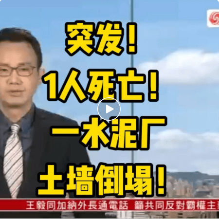 4月19日傍晚,中臺(tái)灣臺(tái)中市太平區(qū)的一座水泥廠擋土墻突然發(fā)生了坍塌,導(dǎo)致一名泰籍的工人遭到活埋,當(dāng)場(chǎng)死亡,意外的原因有關(guān)單位仍在調(diào)查當(dāng)中。