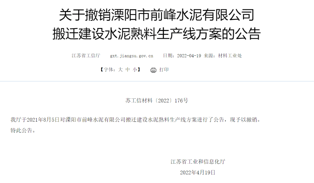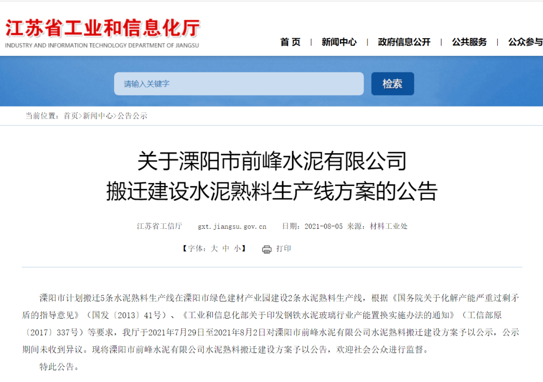 江蘇省工信廳2021年8月5日公告顯示,溧陽市計(jì)劃搬遷5條水泥熟料生產(chǎn)線在溧陽市綠色建材產(chǎn)業(yè)園建設(shè)兩條水泥熟料生產(chǎn)線。根據(jù)相關(guān)文件要求,江蘇省工信廳于2021年7月29日至2021年8月2日對(duì)溧陽市前峰水泥有限公司水泥熟料搬遷建設(shè)方案予以公示,公示期間未收到異議。并將溧陽市前峰水泥有限公司水泥熟料搬遷建設(shè)方案予以公告,歡迎社會(huì)公眾進(jìn)行監(jiān)督。