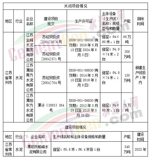 公告附件可見,關(guān)閉項(xiàng)目包括江蘇金峰水泥集團(tuán)3條熟料生產(chǎn)線,江蘇溧陽南方水泥1條熟料生產(chǎn)線以及溧陽東方水泥1條熟料生產(chǎn)線。