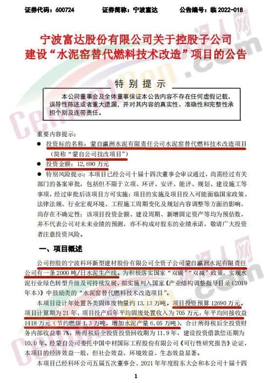 4月21日,寧波富達股份有限公司發(fā)布公告稱其公司控股的寧波科環(huán)新型建材股份有限公司全資子公司蒙自瀛洲水泥有限責任公司2000 噸/日水泥生產線,擬實施列入國家《產業(yè)結構調整指導目錄(2019年本)》中鼓勵類的“水泥窯替代燃料技術改造項目”。