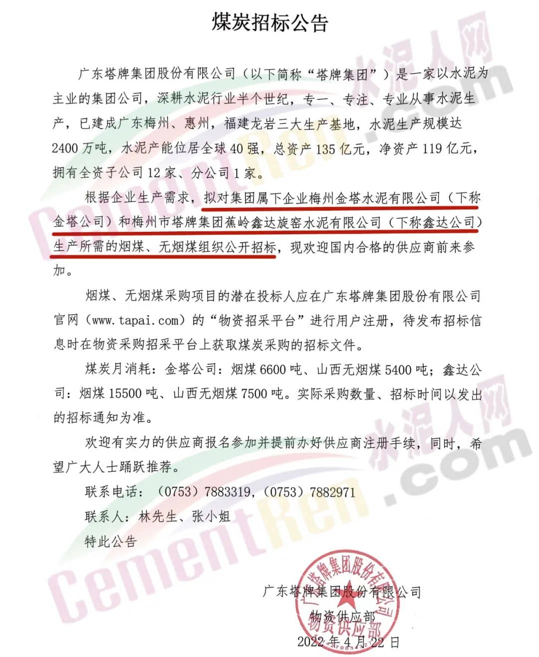 水泥人網(wǎng)作為行業(yè)影響力最大的水泥行業(yè)專業(yè)服務(wù)平臺,多年來致力于為會員單位采購提供更便捷、更高效、更高性價比的服務(wù)。現(xiàn)受塔牌集團委托,協(xié)助其煤炭采購提供優(yōu)質(zhì)供應(yīng)商資源,特對外發(fā)布此采購?fù)ǜ妫?br />