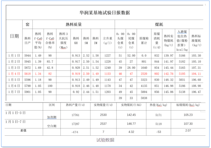 于是,福建朝旭與華潤(rùn)某基地雙方負(fù)責(zé)人進(jìn)行了深入的技術(shù)交流,決定在其基地的5000t/d生產(chǎn)線開(kāi)展使用ZX-014節(jié)煤劑節(jié)煤效果測(cè)試。通過(guò)在生料配方穩(wěn)定的情況下進(jìn)行了噸熟料實(shí)物煤耗、噸熟料標(biāo)準(zhǔn)煤耗,以及添加燃煤催化劑后的噸熟料實(shí)物煤耗、噸熟料標(biāo)準(zhǔn)煤耗的變化測(cè)試。測(cè)試結(jié)果顯示,ZX-014節(jié)煤劑在提升水泥企業(yè)能效,降低生產(chǎn)煤耗方面作用明顯。為后期集團(tuán)其他生產(chǎn)基地節(jié)能降耗減碳新思路、新材料、新方法提供依據(jù)。