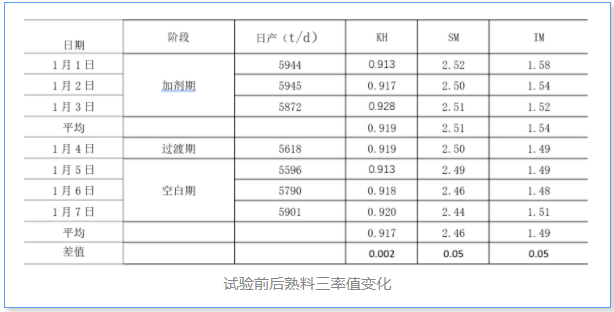 以上數(shù)據(jù)對(duì)比發(fā)現(xiàn)摻加試劑后,熟料三率值均有不同,噸熟料實(shí)物煤耗下降了4.32kg/t,噸熟料標(biāo)煤耗降低2.07kg/t。