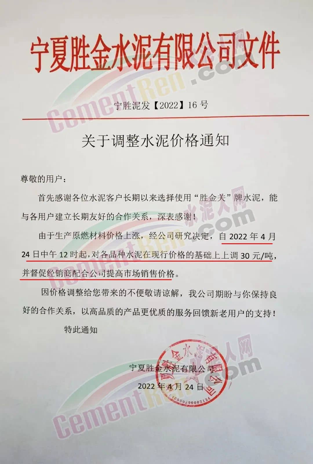 盡管絕大多數(shù)區(qū)域水泥市場行情低迷,但是,為了緩解成本上漲壓力,多區(qū)域主要品牌企業(yè)仍持續(xù)推漲水泥價格。日前寧夏回族自治區(qū)賽馬水泥、瀛海天祥、天元建材等多家品牌企業(yè)通知上調水泥價格20-30元/噸。寧夏勝金水泥有限公司通知,由于生產(chǎn)原燃材料價格上漲,自4月24日中午12時起對各品種水泥在現(xiàn)行價格基礎上上調30元/噸,并督促經(jīng)銷商配合公司提高市場銷售價格。