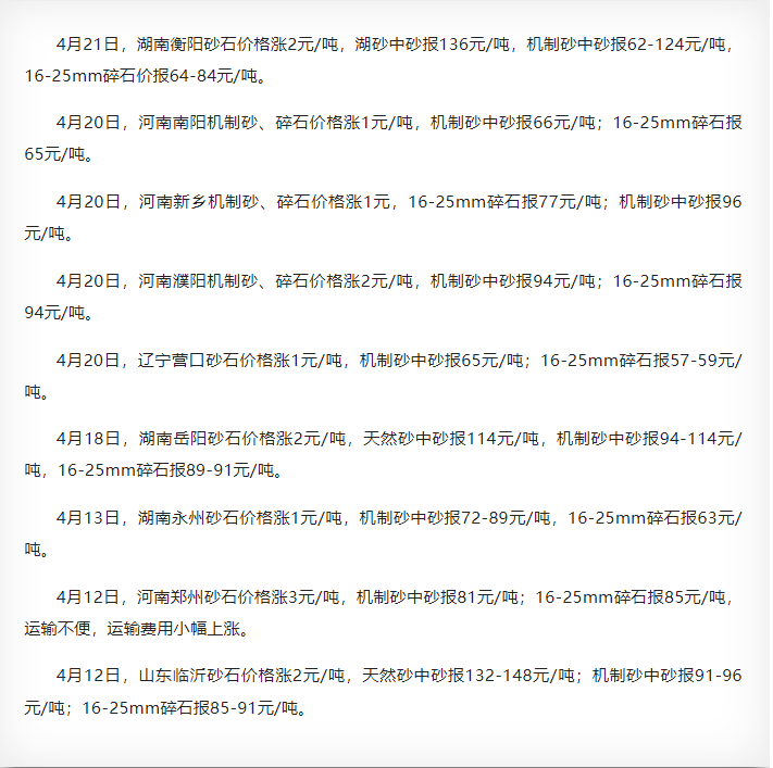 混凝土方面,跟隨水泥漲價同步推漲。4月21日,云南普洱混凝土價格漲10元/方;4月19日,云南麗江混凝土價格漲20元/方;4月18日,廣東云浮混凝土價格漲20元/方;4月12日,石家莊混凝土價格漲30元/方……