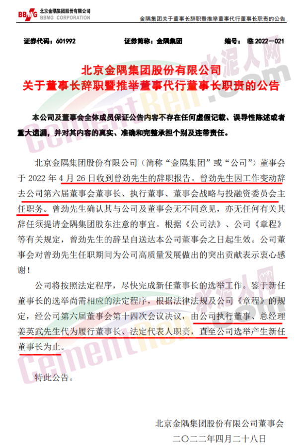 4月27日晚間金隅集團(tuán)發(fā)布公告稱,北京金隅集團(tuán)股份有限公司董事會于 2022 年 4 月 26 日收到曾勁先生的辭職報(bào)告。曾勁先生因工作變動辭去公司第六屆董事會董事長、執(zhí)行董事、董事會戰(zhàn)略與投融資委員會主任職務(wù)。