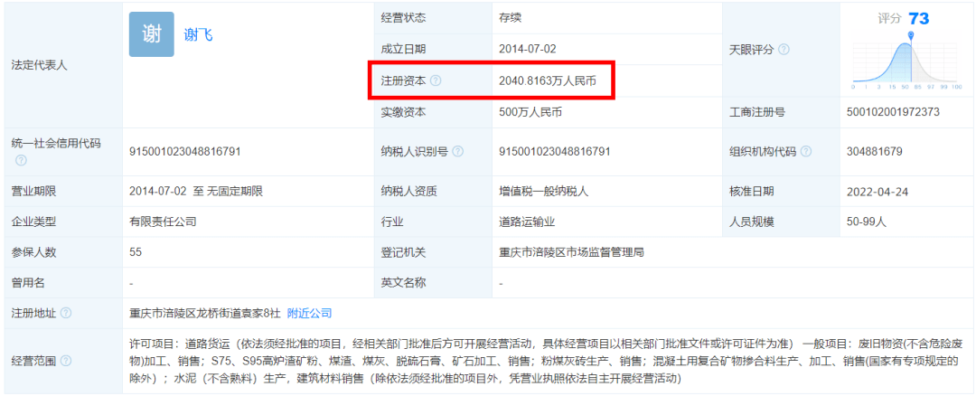 天眼查查詢結(jié)果顯示,重慶市多吉再生資源有限公司,成立于2014-07-02,注冊(cè)資本為2040.8163萬(wàn)人民幣,法定代表人為謝飛,經(jīng)營(yíng)狀態(tài)為存續(xù),工商注冊(cè)號(hào)為500102001972373,注冊(cè)地址為重慶市涪陵區(qū)龍橋街道袁家8社,經(jīng)營(yíng)范圍包括許可項(xiàng)目:道路貨運(yùn)(依法須經(jīng)批準(zhǔn)的項(xiàng)目,經(jīng)相關(guān)部門批準(zhǔn)后方可開展經(jīng)營(yíng)活動(dòng),具體經(jīng)營(yíng)項(xiàng)目以相關(guān)部門批準(zhǔn)文件或許可證件為準(zhǔn)) 一般項(xiàng)目:廢舊物資(不含危險(xiǎn)廢物)加工、銷售;S75、S95高爐渣礦粉、煤渣、煤灰、脫硫石膏、礦石加工、銷售;粉煤灰磚生產(chǎn)、銷售;混凝土用復(fù)合礦物摻合料生產(chǎn)、加工、銷售(國(guó)家有專項(xiàng)規(guī)定的除外);水泥(不含熟料)生產(chǎn),建筑材料銷售(除依法須經(jīng)批準(zhǔn)的項(xiàng)目外,憑營(yíng)業(yè)執(zhí)照依法自主開展經(jīng)營(yíng)活動(dòng))。