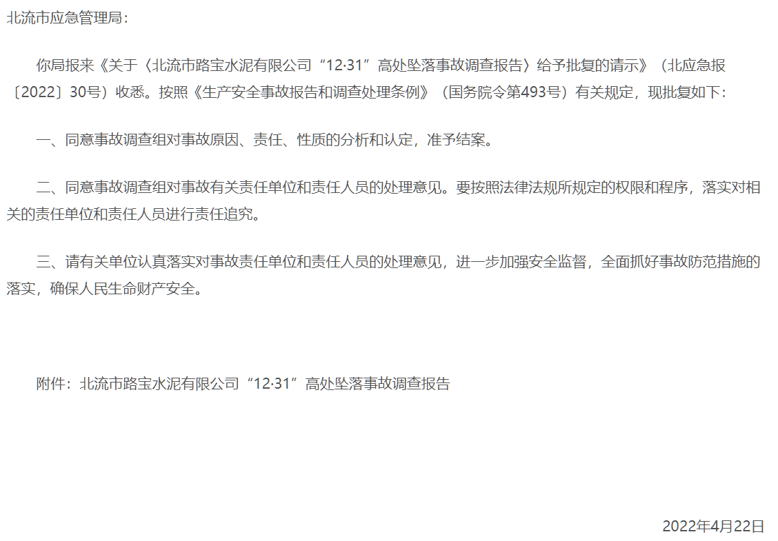 經(jīng)調(diào)查,北流市路寶水泥有限公司“12·31”高處墜落事故是一起一般生產(chǎn)安全責(zé)任事故。