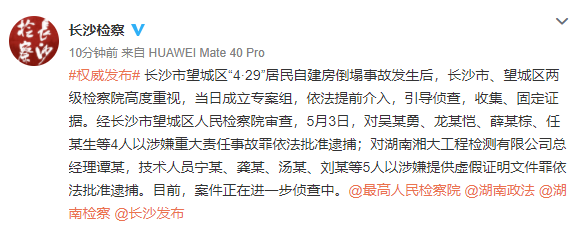 據(jù)湖南省長(zhǎng)沙市人民檢察院官方微博消息,長(zhǎng)沙居民自建房倒塌事故發(fā)生后,長(zhǎng)沙市、望城區(qū)兩級(jí)檢察院高度重視,當(dāng)日成立專案組,依法提前介入,引導(dǎo)偵查,收集、固定證據(jù)。