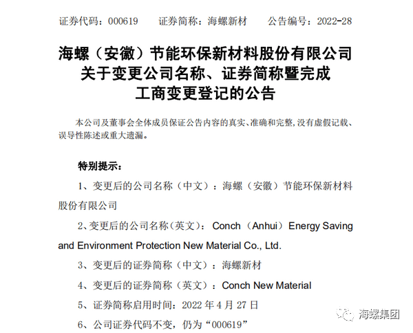年初以來(lái),在海螺集團(tuán)的指導(dǎo)下,海螺新材積極推進(jìn)名稱(chēng)及股票簡(jiǎn)稱(chēng)變更具體工作,3月份完成了新名稱(chēng)工商預(yù)核準(zhǔn),并經(jīng)公司年度董事會(huì)、年度股東大會(huì)審議通過(guò),于4月25日經(jīng)蕪湖市市場(chǎng)監(jiān)督管理局審核登記,領(lǐng)取了新的營(yíng)業(yè)執(zhí)照。