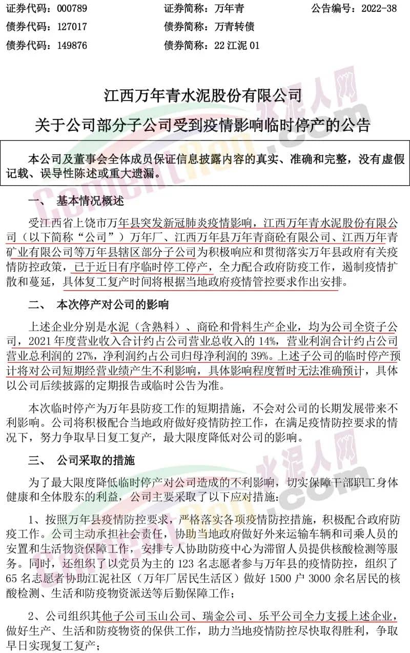 上述企業(yè)分別是水泥(含熟料)、商砼和骨料生產(chǎn)企業(yè),均為公司全資子公司,2021年度營(yíng)業(yè)收入合計(jì)約占公司營(yíng)業(yè)總收入的14%,營(yíng)業(yè)利潤(rùn)合計(jì)約占公司營(yíng)業(yè)總利潤(rùn)的27%,凈利潤(rùn)約占公司歸母凈利潤(rùn)的39%。上述子公司的臨時(shí)停產(chǎn)預(yù)計(jì)將對(duì)公司短期經(jīng)營(yíng)業(yè)績(jī)產(chǎn)生不利影響,具體影響程度暫時(shí)無法準(zhǔn)確預(yù)計(jì),具體以公司后續(xù)披露的定期報(bào)告或臨時(shí)公告為準(zhǔn)。