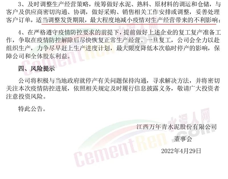 本次臨時(shí)停產(chǎn)為萬年縣防疫工作的短期措施,不會(huì)對(duì)公司的長(zhǎng)期發(fā)展帶來不利影響。公司將積極配合當(dāng)?shù)卣龊靡咔榉揽毓ぷ?,在滿足疫情防控要求的情況下,努力爭(zhēng)取早日復(fù)工復(fù)產(chǎn),最大限度降低對(duì)公司的影響。