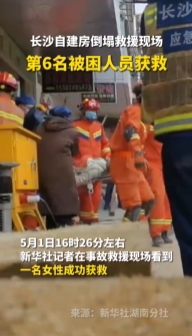 據(jù)央視新聞直播,5月1日下午,在長沙望城區(qū)“4.29”居民自建房倒塌事故現(xiàn)場,經(jīng)過50多個小時的救援,第6名被困人員被救出。據(jù)悉,該名被困人員是一名女性,在4月30日下午2點多被發(fā)現(xiàn)。