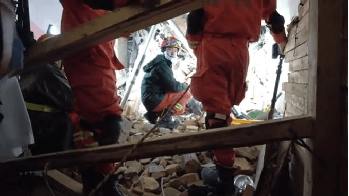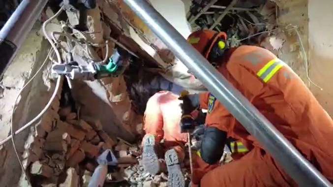 現(xiàn)場消防救援人員使用“蛇眼”音視頻生命探測儀,來精確定位被埋者位置。