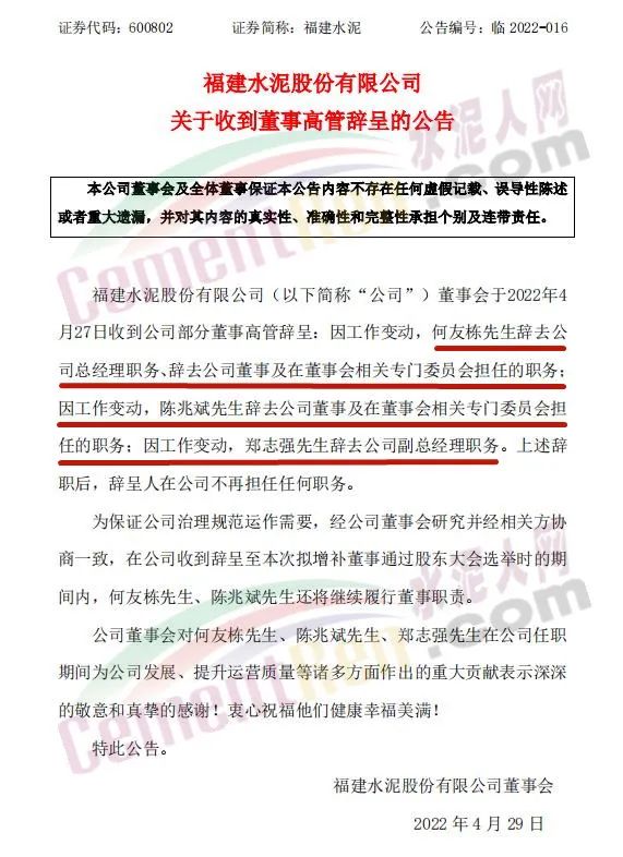 同期,福建水泥股份有限公司發(fā)布《關(guān)于收到董事高管辭呈的公告 》稱(chēng),因工作變動(dòng),何友棟先生辭去公司總經(jīng)理職務(wù)、辭去公司董事及在董事會(huì)相關(guān)專(zhuān)門(mén)委員會(huì)擔(dān)任的職務(wù);因工作變動(dòng),陳兆斌先生辭去公司董事及在董事會(huì)相關(guān)專(zhuān)門(mén)委員會(huì)擔(dān)任的職務(wù);因工作變動(dòng),鄭志強(qiáng)先生辭去公司副總經(jīng)理職務(wù)。