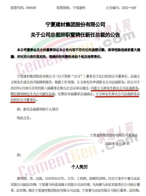 4月28日,寧夏建材集團(tuán)股份有限公司發(fā)布《關(guān)于公司總裁辭職暨聘任新任總裁的公告》稱(chēng),同意王玉林先生辭去公司總裁職務(wù),聘任蔣明剛先生為公司新任總裁,任期至本屆董事會(huì)屆滿止。王玉林先生辭去公司總裁職務(wù)后仍擔(dān)任公司董事長(zhǎng)。