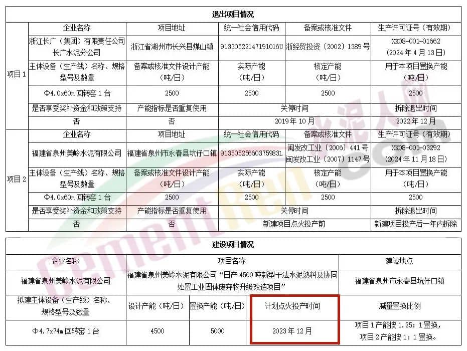 據水泥人網了解,此前,福建省工信廳曾發(fā)布《關于福建省泉州美嶺水泥有限公司日產4500噸新型干法水泥熟料生產線建設項目產能置換方案的公告》,公告顯示,福建省泉州美嶺水泥有限公司“日產4500噸新型干法水泥熟料及協(xié)同處置工業(yè)固體廢棄物升級改造項目”由浙江長廣(集團)有限責任公司長廣水泥分公司2500t/d和福建省泉州美嶺水泥有限公司2500t/d分別按照1.25:1和1:1的置換比例置換而來。計劃點火投產時間為2023年12月。