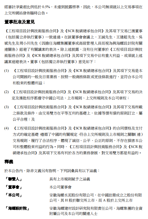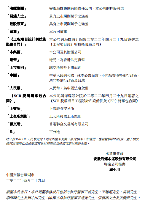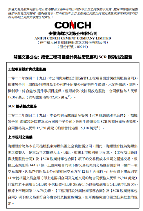 SCR脫硝技改服務(wù),2022年4月29日,本公司與海螺設(shè)計(jì)院簽署《SCR脫硝總承包合同》,根據(jù)該合同,海螺設(shè)計(jì)院將為本公司若干子公司之熟料生產(chǎn)線提供SCR脫硝技術(shù)改造服務(wù),注合同價(jià)格為人民幣12,750萬元(約相當(dāng)于港幣15,118萬元)。