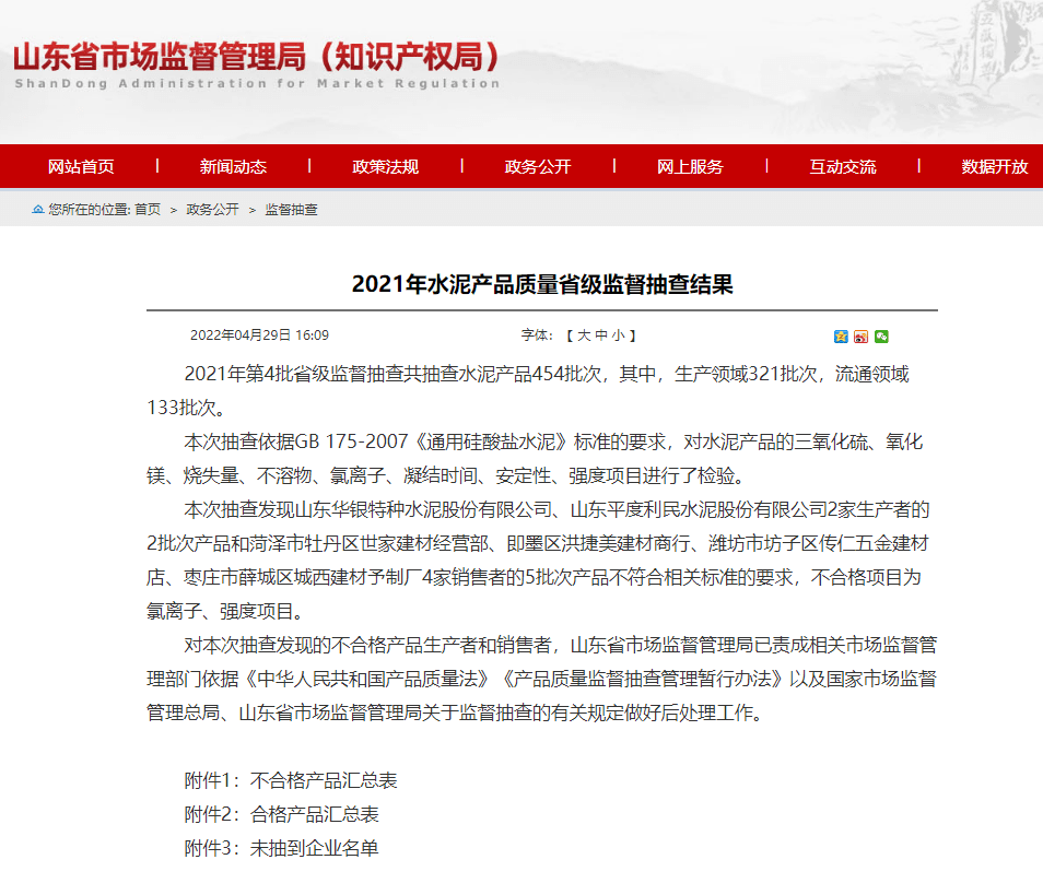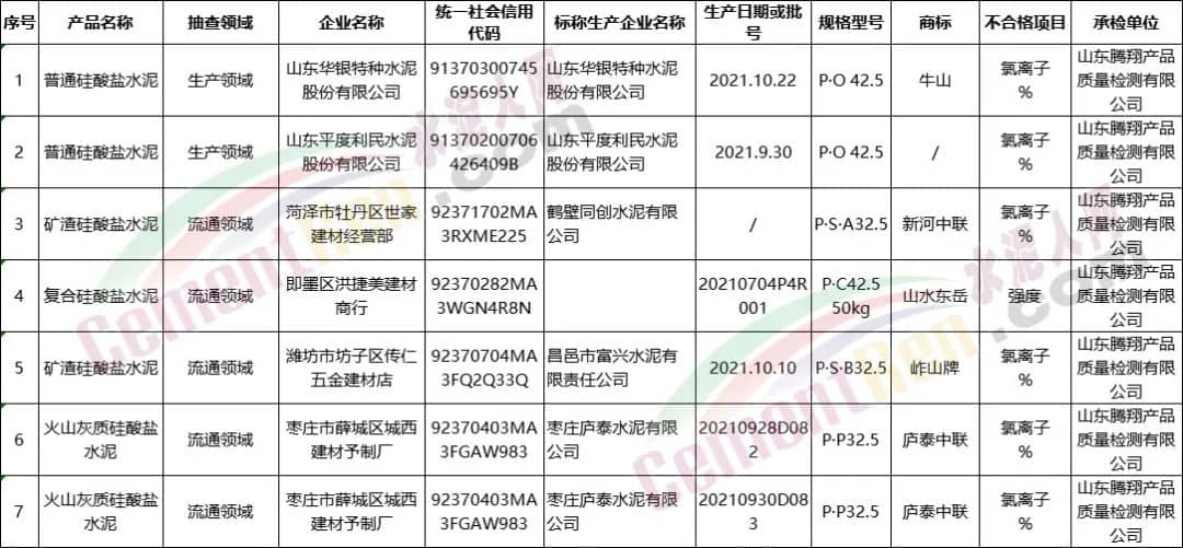 抽查發(fā)現山東華銀特種水泥股份有限公司、山東平度利民水泥股份有限公司2家生產者的2批次產品和菏澤市牡丹區(qū)世家建材經營部、即墨區(qū)洪捷美建材商行、濰坊市坊子區(qū)傳仁五金建材店、棗莊市薛城區(qū)城西建材予制廠4家銷售者的5批次產品不符合相關標準的要求,不合格項目為氯離子、強度項目。